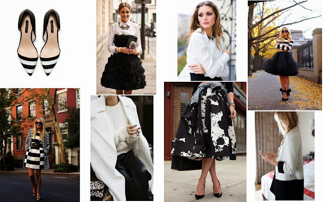 Örneklerde de gördüğümüz gibi, siyah-beyazın desenli baskılı hali kadar çizgili hali de moda. Simsiyah bir parçanın bembeyaz bir parçayla kombinlendiği hali kadar puantiye hali de moda.